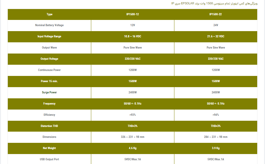 اینورتر 1500 وات EPSOLAR، تمام سینوسی است و در دو مدل IP1500-12 با ولتاژ ورودی 12 ولت و IP1500-22 با ولتاژ ورودی 24 ولت وارد بازار شده است.