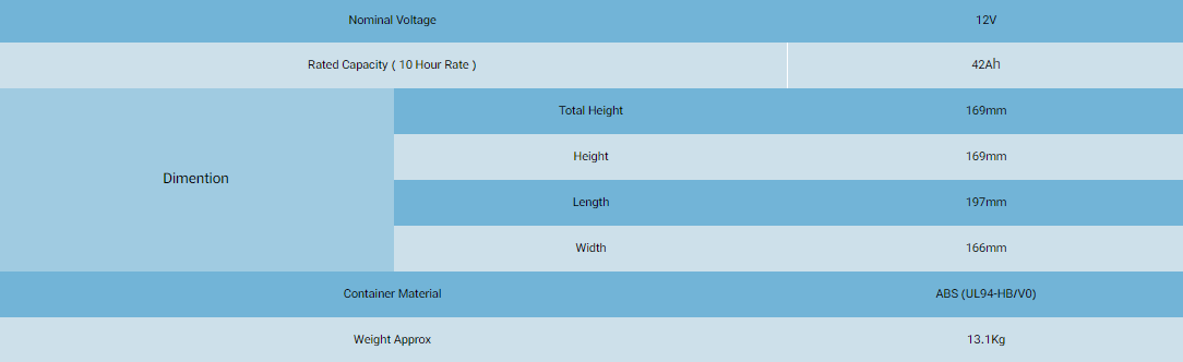 باتری قابل شارژ 42Ah ، مناسب برای ذخیره انرژی در انواع کاربردهای UPS ، خورشیدی ، نیروگاهی و … است .این باتری از نوع VRLA SEALED AGM ( باتری سرب اسید ) است که نیازی به نگهداری ندارد و قابلیت خالی شدن تا بخش زیادی از ظرفیت خود بدون آسیب دیدن دارد .