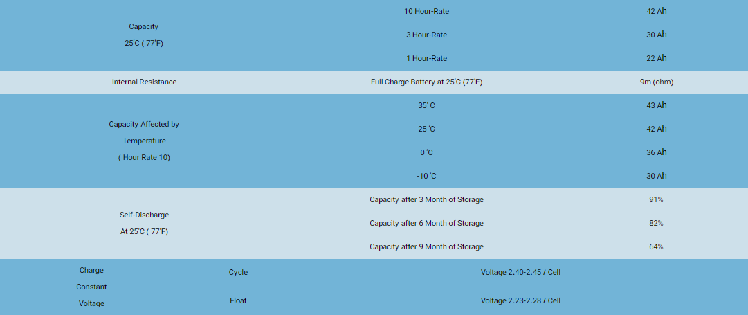 ظرفیت باتری 42 آمپرساعت در 25 درجه سانتی گراد با دشارژ 10 ساعته ( باتری در 10 ساعت از شارژ کامل به حالت تخلیه برسه ) : 42Ah