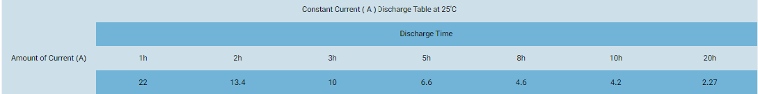 ظرفیت باتری 42 آمپرساعت در 25 درجه سانتی گراد با دشارژ 1 ساعته ( باتری در 1 ساعت از شارژ کامل به حالت تخلیه برسه ) : 22Ah