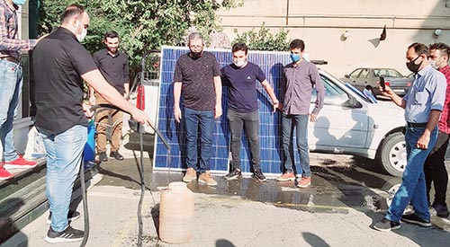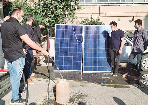 این تصویر مربوط به دوره برق خورشیدی نورینو است که در این دوره شرکت کنندگان با سایه خود روی سطح پنل خورشیدی را به طور کامل پوشانده اند و این موضوع باعث کاهش فشار آب خروجی شده است.