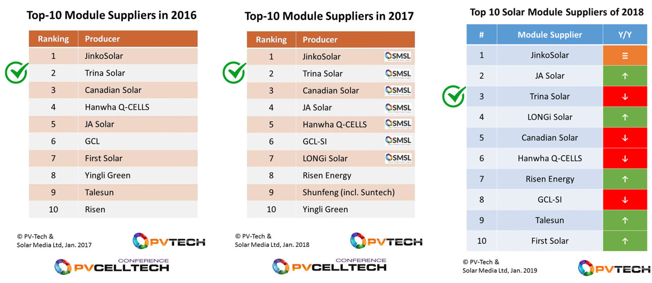 پنل خورشیدی ترینا سولار Trina Solar جزء 10 برند برتر دنیا در صنعت انرژی خورشیدی است و در سالهای 2016 تا 2018 رتبه دوم و سوم را کسب کرده است: