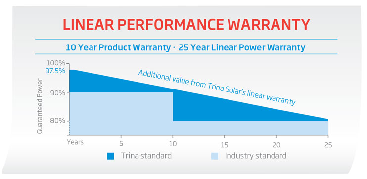 پنل خورشیدی ترینا سولار 330 وات پلی کریستال دارای 25 سال گارانتی راندمان است. این گارانتی به صورت دقیق در تصویر زیر آمده است. اگر راندمان پنل خورشیدی در سال های اشاره شده تا 25 سال، از مقدار راندمان ذکر شده کمتر شود میتوانید با مراجعه به نمایندگی ترینا سولار در ایران درخواست تعویض و یا تعمیر رایگان پنل را بدهید.