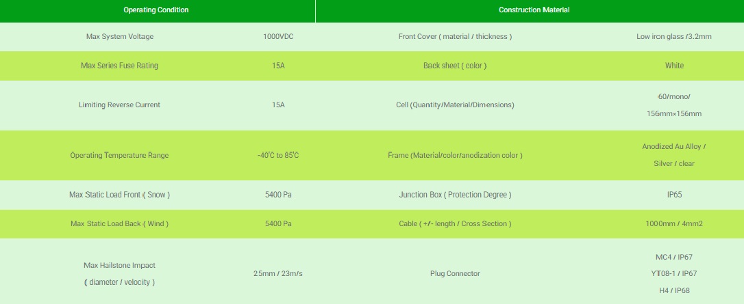ماکزیمم مقاومت استاتیکی در برابر برف و باد 5400 پاسکال است . در برابر تگرگ تا قطر 25 میلیمتر و سرعت 23 متر بر ثانیه هم مقاوم است . اما در برابر ضربات غیر طبیعی مثل راه رفتن روی پنل یا افتادن سنگ آسیب پذیر است و از گارانتی هم خارج میشود .
