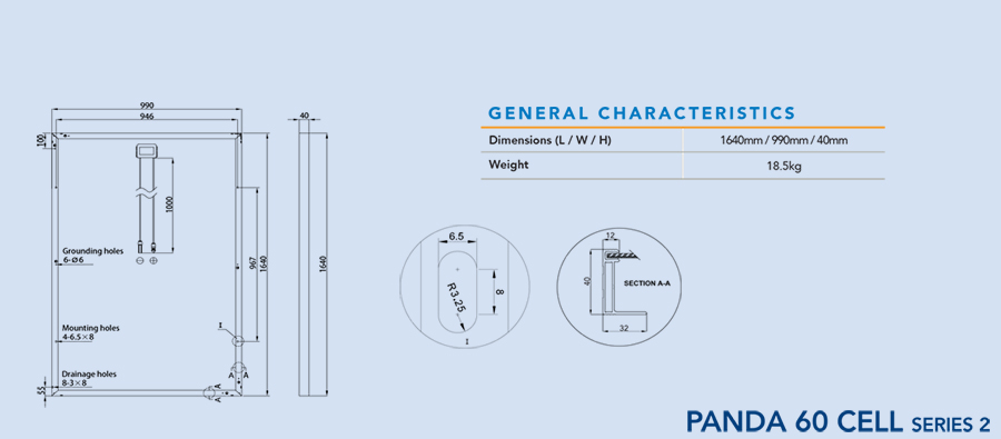 ابعاد ( طول ، عرض ، پهنا ) 1640mm × 990mm × 40mm است . به عبارتی مساحت هر پنل 1.624 مترمربع است .