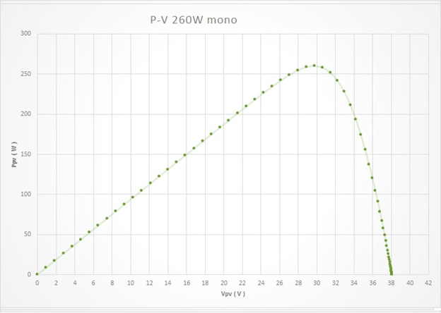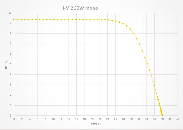 پنلهای مونو بازده بالاتری نسبت به پنلهای پلی دارند اما قیمت آنها نیز بالاتر است. پنل 60 سلولی ( 260 تا 280 ) هم برای استفاده مصارف خانگی آفگرید (Off Grid ) و هم برای مصارف نیروگاهی آنگرید (On Grid) ، مناسب است . نمودار P-V و I-V در تابش 1000W/m2 در زیر آمده است: