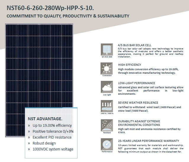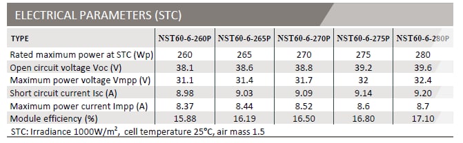 برگه اطلاعات پنل خورشیدی 265 وات در شرایط STC