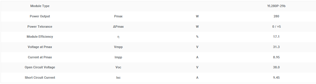 بیشترین ولتاژ خروجی پنل خورشیدی 280 وات پلی کریستال YINGLI مدل YL280P-29b در بیشترین توان، 31.3 ولت می باشد و جریان خروجی آن 8.95 آمپر است. همچنین ولتاژ مدار باز این پنل 38 ولت و جریان مدارباز آن 9.45 آمپر است.