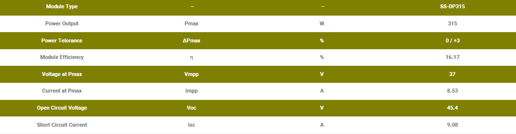 پنلهای 315 وات SHINSUNG کره مدل SS-DP315 دارای ابعاد 1964 در 992 بوده و دارای 21.6 کیلوگرم وزن می باشد. در این پنل های خورشیدی راندمان ماژول 16.17 درصد و راندمان سلولی بالای 20 درصد است. فرم اطراف این پنل خورشیدی آلومینیوم آنودایز شده است که از آن محافظت می نماید.