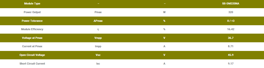پنل خورشیدی 320 وات مونوکریستال SHINSUNG ساخت کشور کره جنوبی میباشد و تکنولوژی مونو کریستال دارد . مونو کریستال برای مناطق سردسیر و شرجی بسیار مناسب میباشد. ابعاد پنل خورشیدی 320 وات مونو کریستال 1964 در 992 میلی متر است و وزنی در حدود 21.6 کیلوگرم دارد. یکی از ویژگی های مونو کریستال کیفیت بسیار بالا و راندمان بیشتر است. ولتاژ خروجی در بیشترین توان این پنل 36.7 ولت است و جریان خروجی در بیشترین توان آن 8.71 آمپر میباشد.