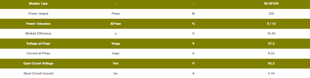 پنل خورشیدی 320 وات پلی کریستال SHINSUNG ساخت کشور کره جنوبی میباشد و تکنولوژی پلی کریستال دارد . پلی کریستال ضریب دمایی کمتری نسبت به مونو کریستال دارد و به همین دلیل برای مناطق گرمسیر بسیار مناسب میباشد. ابعاد پنل خورشیدی 320 وات پلی کریستال 1964 در 992 میلی متر است و وزنی در حدود 21.6 کیلوگرم دارد. یکی از ویژگی های پلی کریستال این است که نسبت به مونو کریستال قیمت کمتری دارد که باعث شده است صرفه اقتصادی بیشتری داشته باشد. ولتاژ خروجی در بیشترین توان این پنل 37.5 ولت است و جریان خروجی در بیشترین توان آن 8.55 آمپر میباشد.